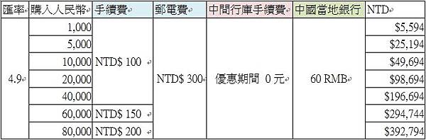 台灣各大銀行皆開始搶攻台幣匯人民幣業務,推出OBU,DBU相關業務,尤其是一般個人適用的DO-MESTIC BANKING UNIT(簡稱DBU),更是大受國人青睞,以目前銀行推出的業務,台灣匯款至大陸一天限匯出8萬人民幣,而當日最高買入金額也受限2萬人民幣,假設一次要匯8萬人民幣,你就得先連買四天的2萬人民幣,再一次匯出才能省手續費,畢竟跨境手續費及郵電加一加還挺嚇人的,如下表所示: