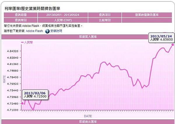 近期人民幣商機炒得沸沸揚揚,尤其是人民幣升值看俏,今年2/6以來,人民幣升值步伐加速,引起市場廣泛關注。截至5/24,人民幣對台幣從4.725一路飆升到4.858,升值幅度達2.8%,意思是如果你在2/6用100萬台幣買人民幣211,640,在5/24就可以換回台幣1,028,147,短短三個月就現賺2.8萬,以台灣這種低率行情下(依活期0.33%來算),100萬存八年都還沒有這樣的利息,重點是甚麼事都不用做……